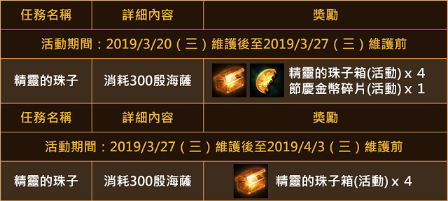 活動期間消耗300殷海薩的祝福即可完成任務,並獲得「精靈的珠子箱(活動)x4」,開啟精靈的珠子箱(活動)會隨機獲得一顆精靈的珠子,蒐集各種屬性精靈的珠子可製作活動期間限定製作的道具喔!