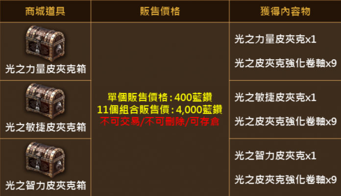而光之皮夾克裝備在活動結束後不會刪除可永久使用,但是無法存倉、交易和刪除,而且之後有可能變為常態性銷售的商城商品(如同耳環、戒指),一切等官方公布為準。