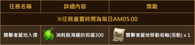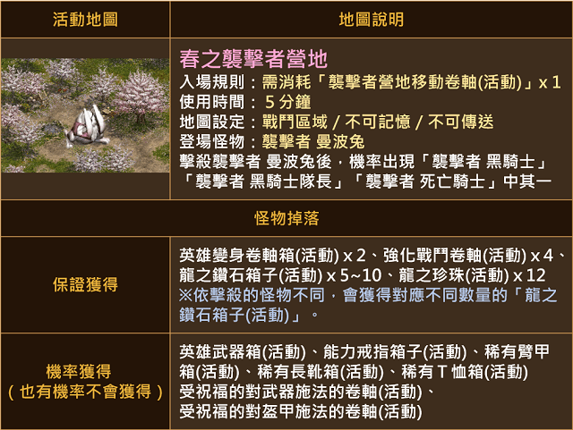 活動期間內,60等(含)以上玩家,完成「襲擊者營地入侵」任務後,可獲得「襲擊者營地移動卷軸(活動)」使用卷軸後將會移動至活動副本「春之襲擊者營地」。