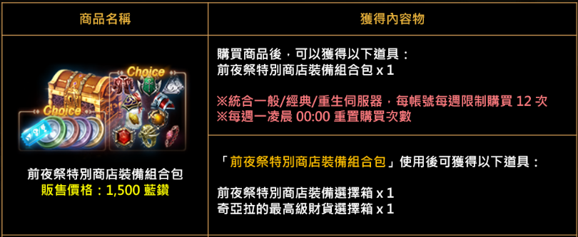 | 商城道具名稱 | 槍手改版EP特別製作憑證 | 前夜祭商店裝備組合包 |