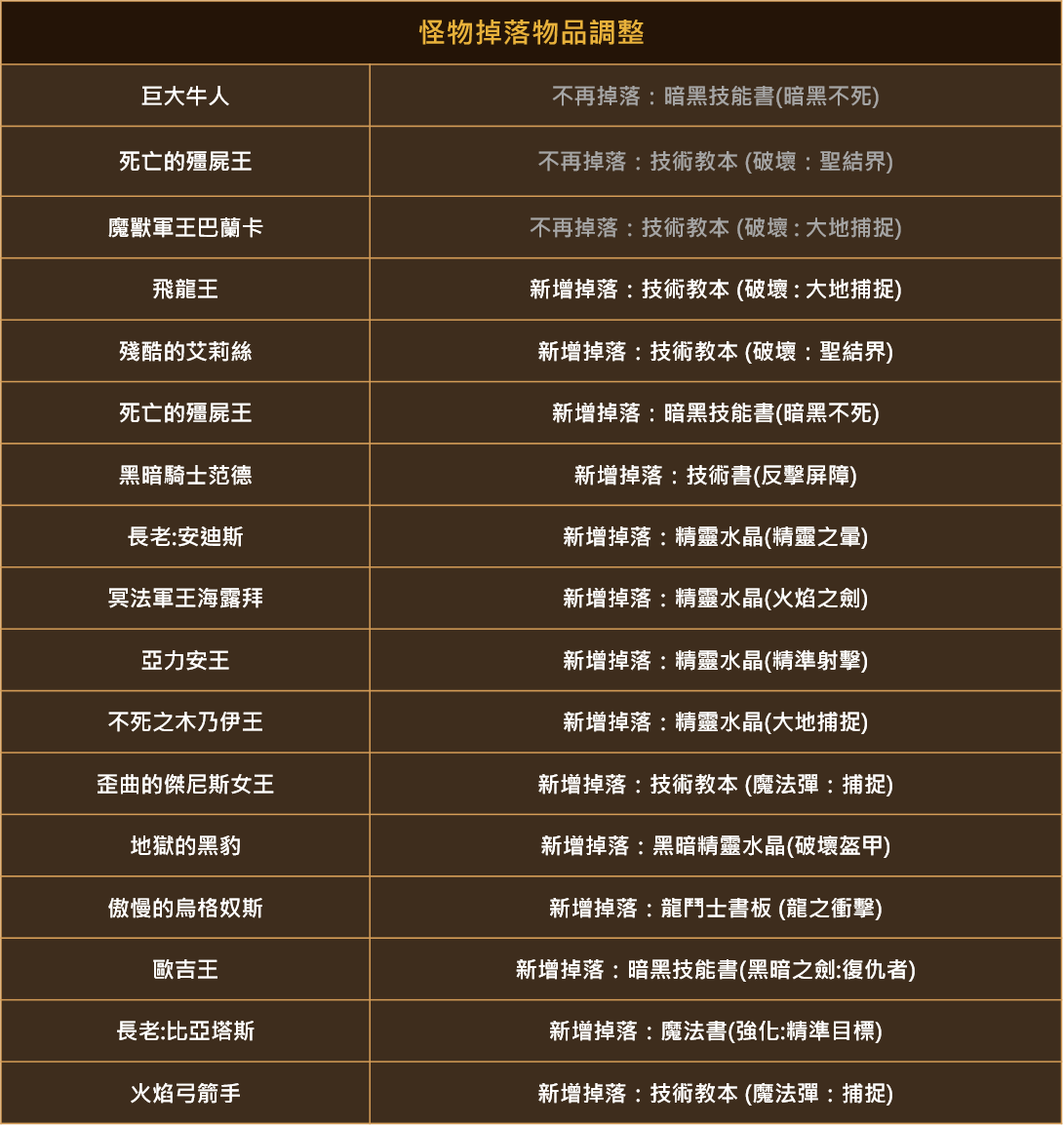 遊戲攻略掉寶資料 最新BOSS新增掉落道具,含新技能精靈之暈、大地捕捉、火焰之劍 By 大補帖小編(編董) - 2020/05/06 高階妖精改版之後,野外 BOSS 難度隨之調高,隨之調整的部分則包含新增掉落技能書,譬如精靈之暈、大地捕捉、火焰之劍等等,以下提供官方釋出的最新資料。 官方資訊 相關 更多相關攻略與資訊 BOSS 時間將大調整:拉洞、傲慢之塔、象牙塔、遺忘之島、烈焰地監 天堂M「衝突之塔」設定介紹,怪物/BOSS/掉寶/BOSS出現時間/隱藏BOSS 底比斯金字塔 BOSS 100% 掉落紅裝臂甲+褲子? [影片] 跨服副本「次元裂痕」介紹與解說,不參加就虧了 技巧:兩個設定讓你在世界BOSS副本打到怪物