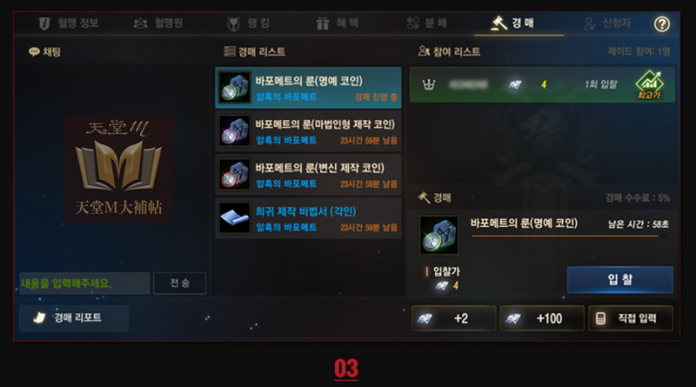 在韓服天堂M更新到第二章後,不僅更新了血盟突襲和世界王的 BOSS,為了讓血盟突襲的獎勵有更多的分配管道推出「血盟獎勵拍賣系統」,讓副本中打到的寶物可以透過拍賣給需要的盟友,同時其他有參與突襲的盟友還可以分配到拍賣所收入的鑽石,對於血盟互動而言可以讓大家更願意參與盟副,也能解決長久以來分配寶物的問題。