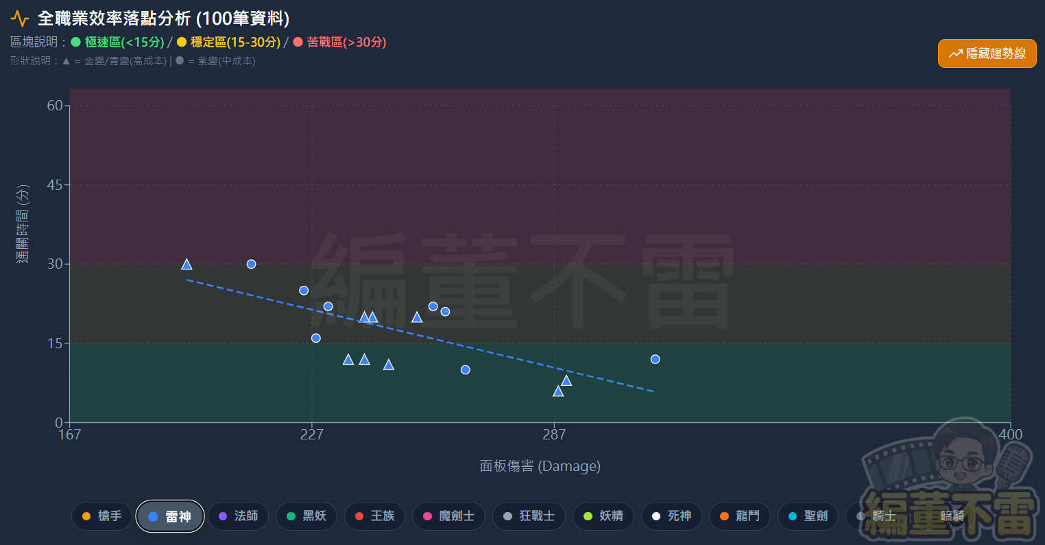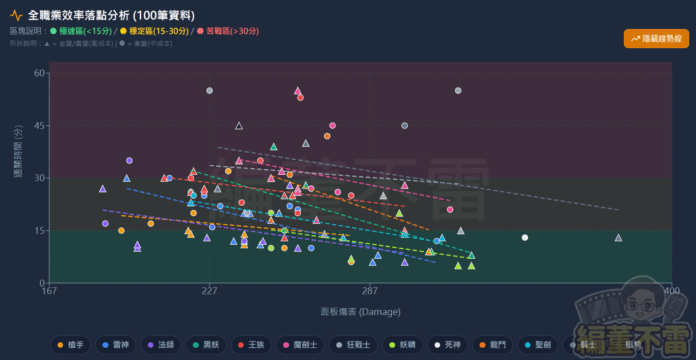 網頁的透過視覺化的散佈圖與趨勢線,揭示各職業在面對地龍(安塔瑞斯)時的真實戰鬥效率