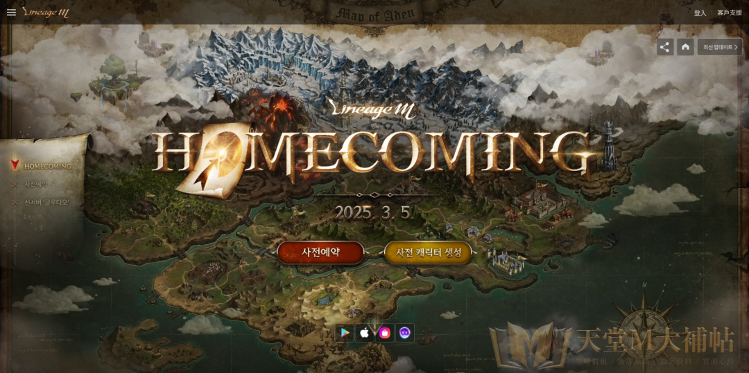 《HOMECOMING》改版日訂在 2025/3/5,首頁背景為天堂M的亞丁大陸世界地圖,且在標題處呼應之前公布的回捲圖示,有邀請玩家回歸之意。