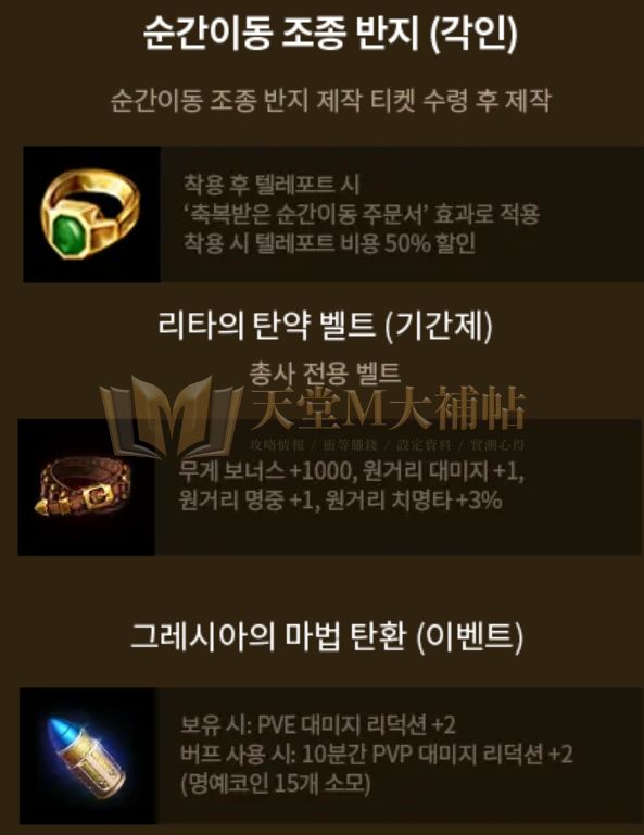- 傳送控制戒指:配戴裝備順移時,會發生祝瞬的效果。傳送費用享有50%折扣