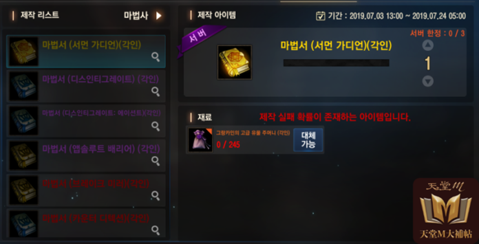 本週新增的金技為法師的「守護神召喚」,也就是招喚術,每個伺服器限定 3 本,製作需要 245 個高級遺物袋(735 個一般遺物袋)