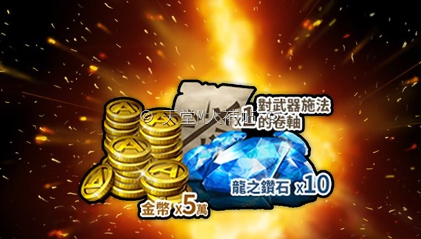 參加預先登錄活動的玩家在開服之後可以獲得對武器施法的卷軸、天幣 50,000 以及龍之鑽石 10 顆,比起沒有參加登陸活動的人,初期這些獎勵會讓你在戰鬥練功上贏別人許多。