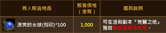 1. 活動期間內可與奇岩村莊的丹尼斯[水球商人],購買活動副本專用技能道具《涼爽的水球》。