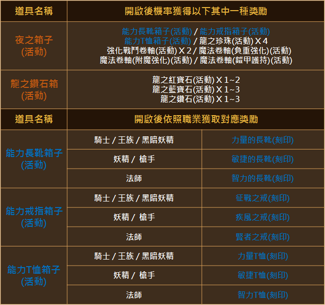 ※夜之箱子(活動)、龍之鑽石箱(活動)開啟獲得的道具,也將於2018/12/12 (三)AM05:00統一進行刪除。