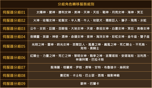 因應世界地監推出,先前官方已經公告過世界地監的伺服器分組名單,緊接著隨著大移民活動結束,玩家將可透過小移民在伺服器分組內自由移動,次數限制為 2 次。以下為伺服器分組名單