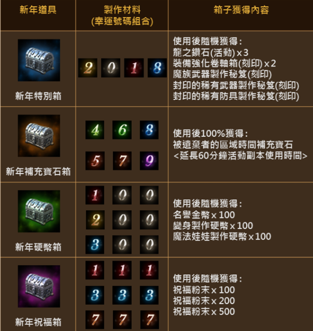 - 新年特別箱:封印的稀有武器/防具製作祕笈(刻印)、龍之鑽石(活動)3個、魔族武器製作秘笈(刻印)、裝備強化卷軸箱(刻印)2個,隨機開到一種