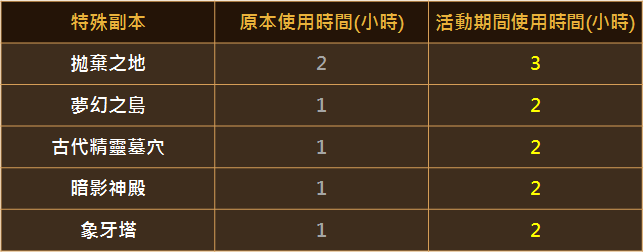 副本時間打不夠?明天維修後將把五大副本的時間增加一小時,與韓版今天的更新同步。此外新增雪壁的隱藏寶物活動,等級 45 以上就可參加,有極低的機率拿到英雄級武器裝備。因應接下來的拉斯塔巴德改版同步更新異界系列裝備及拉斯塔巴德裝備。