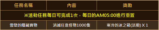 2.完成每日任務【雪壁的隱藏寶物】,可獲得道具獎勵【寒冷的冰之箱(活動)】1個,請於2019/1/28(一)維護前開啟使用。