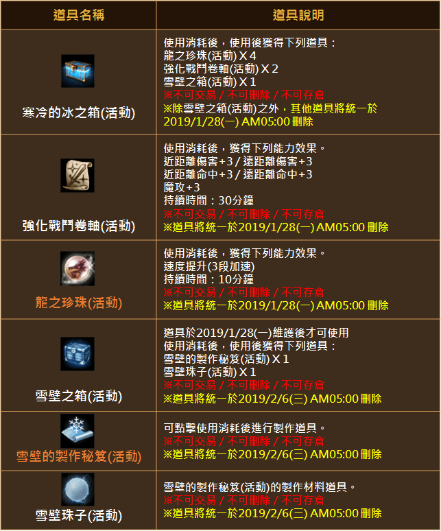 3.活動道具【雪壁之箱(活動)】將於2019/1/28(一)維護後才可開啟。