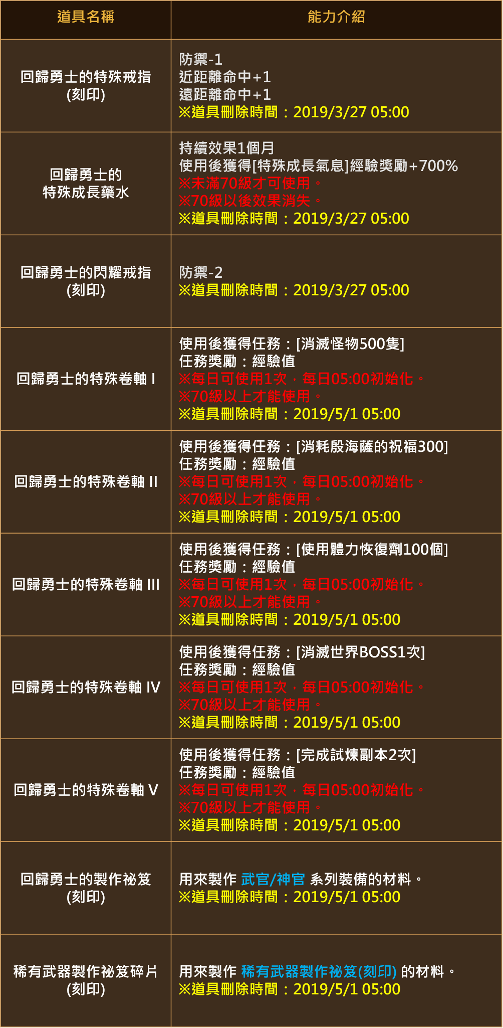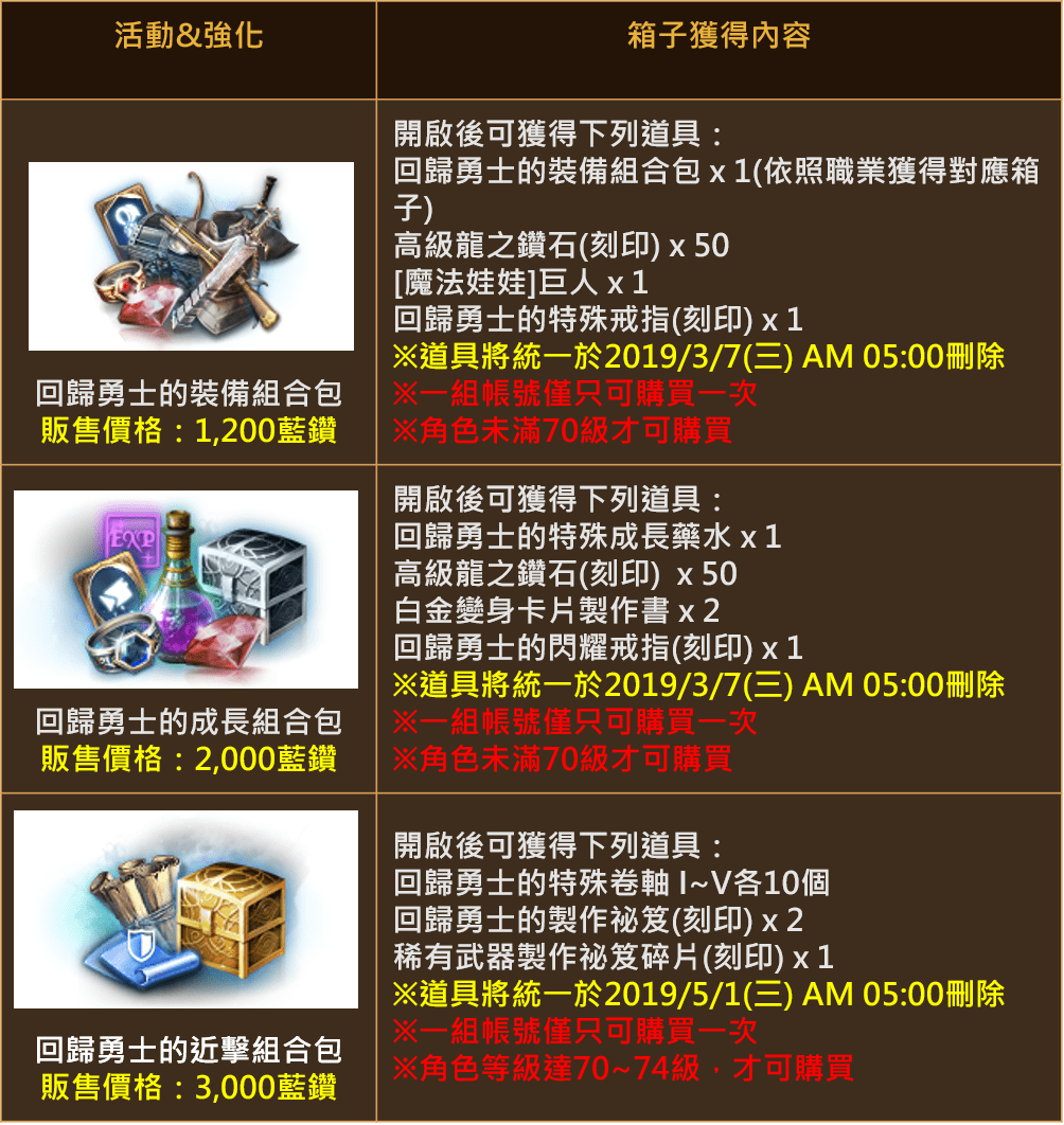 新增期限制販售商品「回歸勇士的裝備組合包」、「回歸勇士的成長組合包」、「回歸勇士的近擊組合包」。