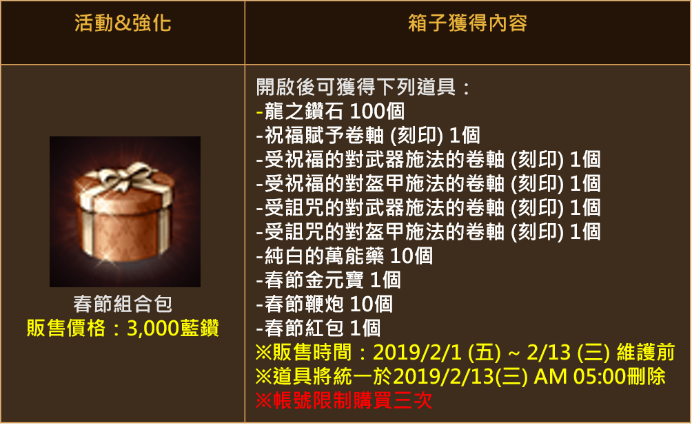 活動期間內至『商城→活動&強化』使用藍鑽可購買「春節成長箱」,開啟春節成長箱保證獲得春節成長藥水x3,還有機率可獲得「傳說級變身」。