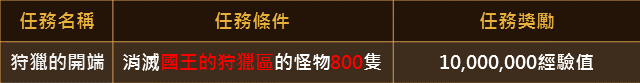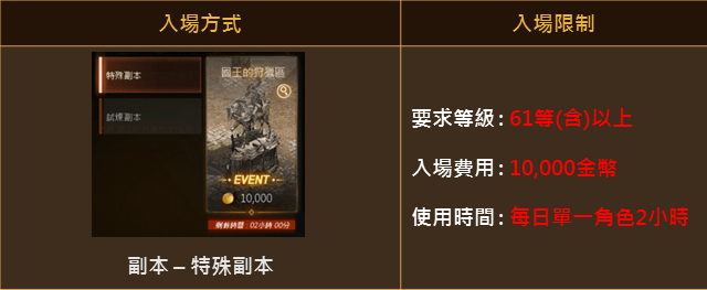 ※ 國王的狩獵區進入限制為61等(含)以上;每次入場費為10,000金幣。