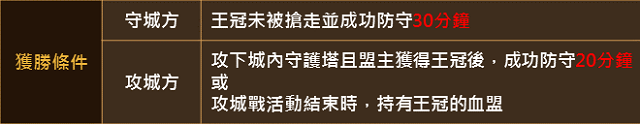 ※ 當有血盟獲得王冠後,守護塔與城門將被重建,且其餘玩家將被傳送至鄰近村莊,並開始下一輪的攻城/守城。