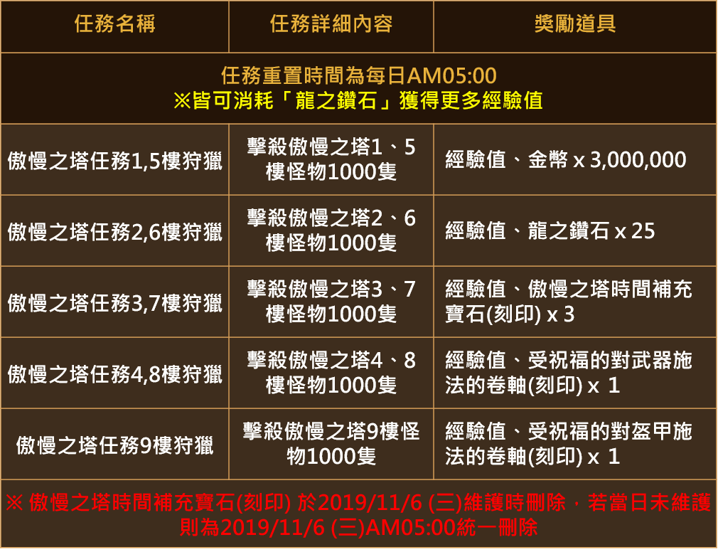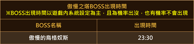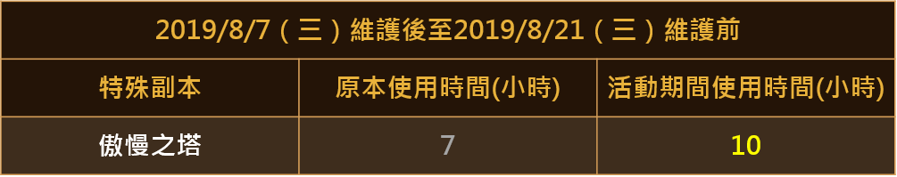 ※傲慢之塔每週每個角色使用時間為7小時(角色不共用),活動期間(8/7維護後~8/21維護前)延長3小時,共可使用10小時,重置時間為每週(三)AM05:00。