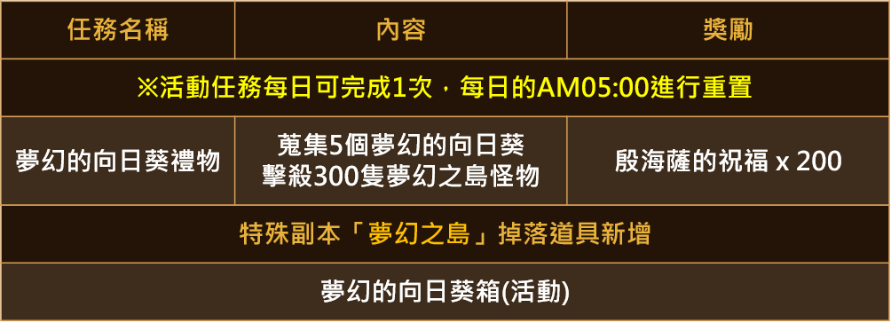 2.活動期間內,進入特殊副本「夢幻之島」打怪有機率獲得「夢幻的向日葵箱(活動)」。