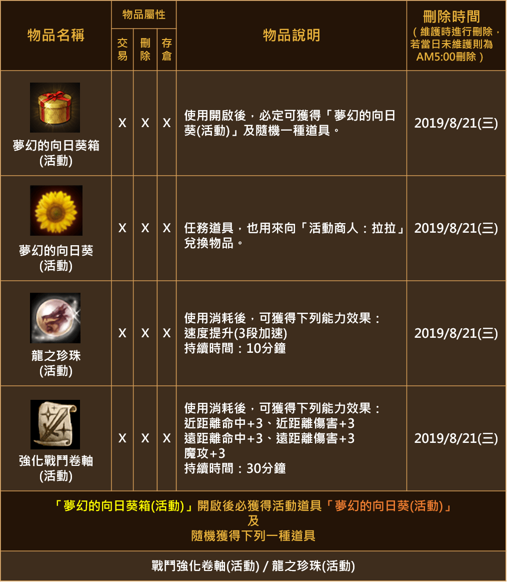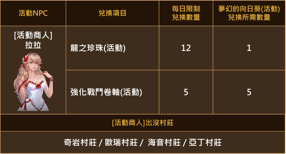 4.收集到的「夢幻的向日葵(活動)」可於活動期間內,向出現在「奇岩村莊」、「歐瑞村莊」、「海音村莊」、「亞丁村莊」的「活動商人:拉拉」兌換「龍之珍珠(活動)」、「強化戰鬥卷軸(活動)」等活動道具。