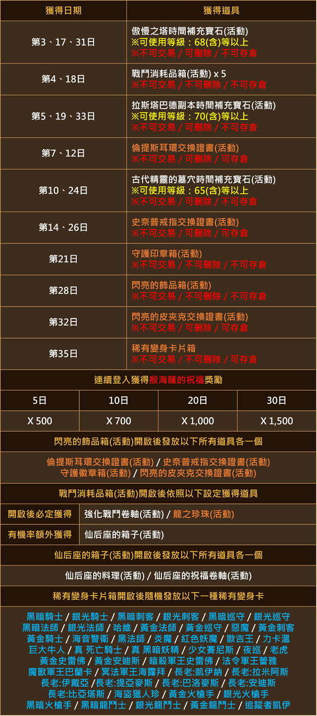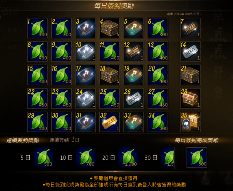 ※ 35日為一週期,期滿後到活動結束期間,統一登入獎勵為「每日簽到完成獎勵」。