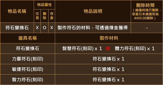 維護後可至『其他→材料道具』製作「符石變換石」,『飾品→符石』使用「符石變換石」製作符石。