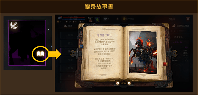 維護後傳說等級以上變身,將會在變身人物頁面多出書頁的按鈕,點擊可開啟各人物的故事書。