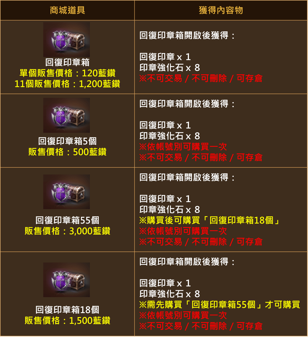 2019/8/7(三)維護後至2019/9/4(三)維護前限時販售「回復印章箱5個」及「回復印章箱55個」優惠組合包喔