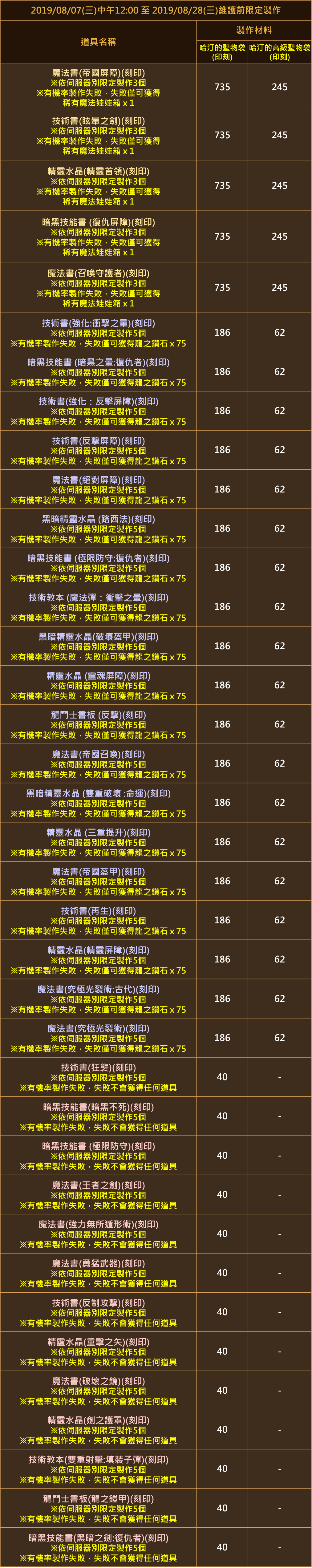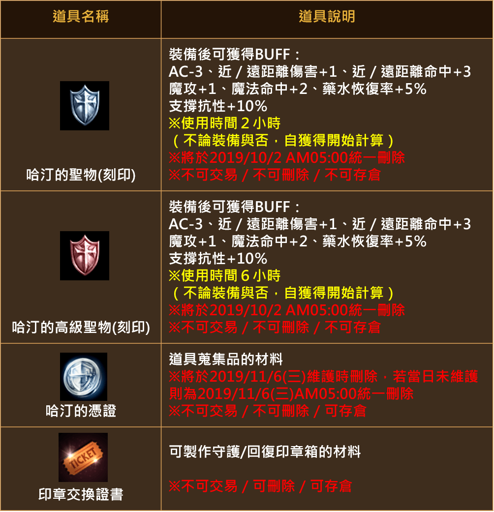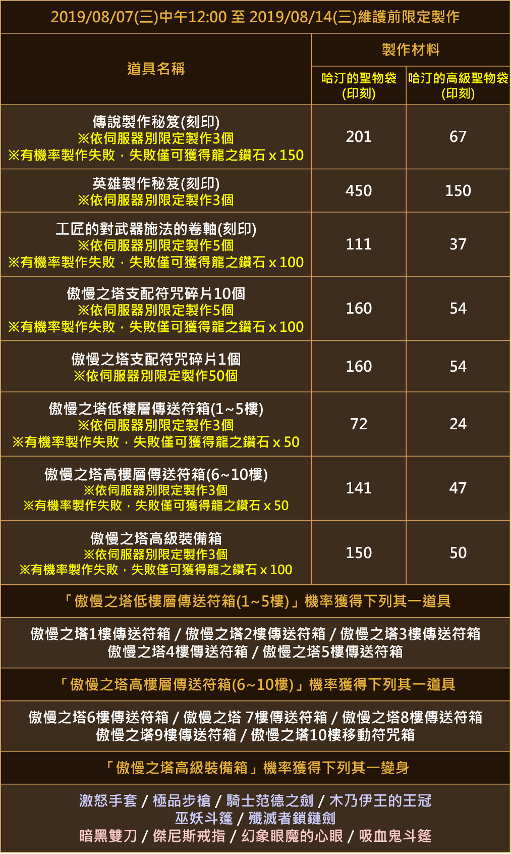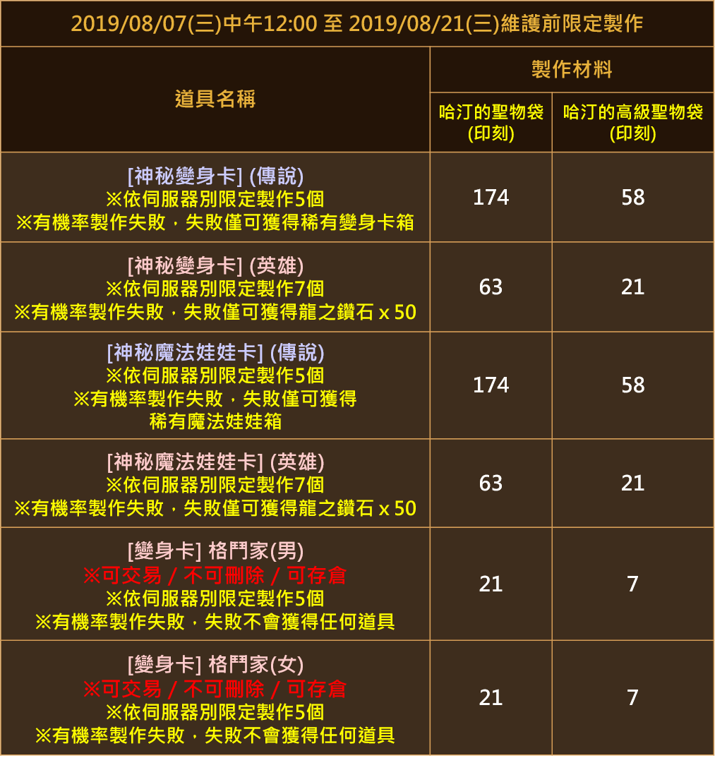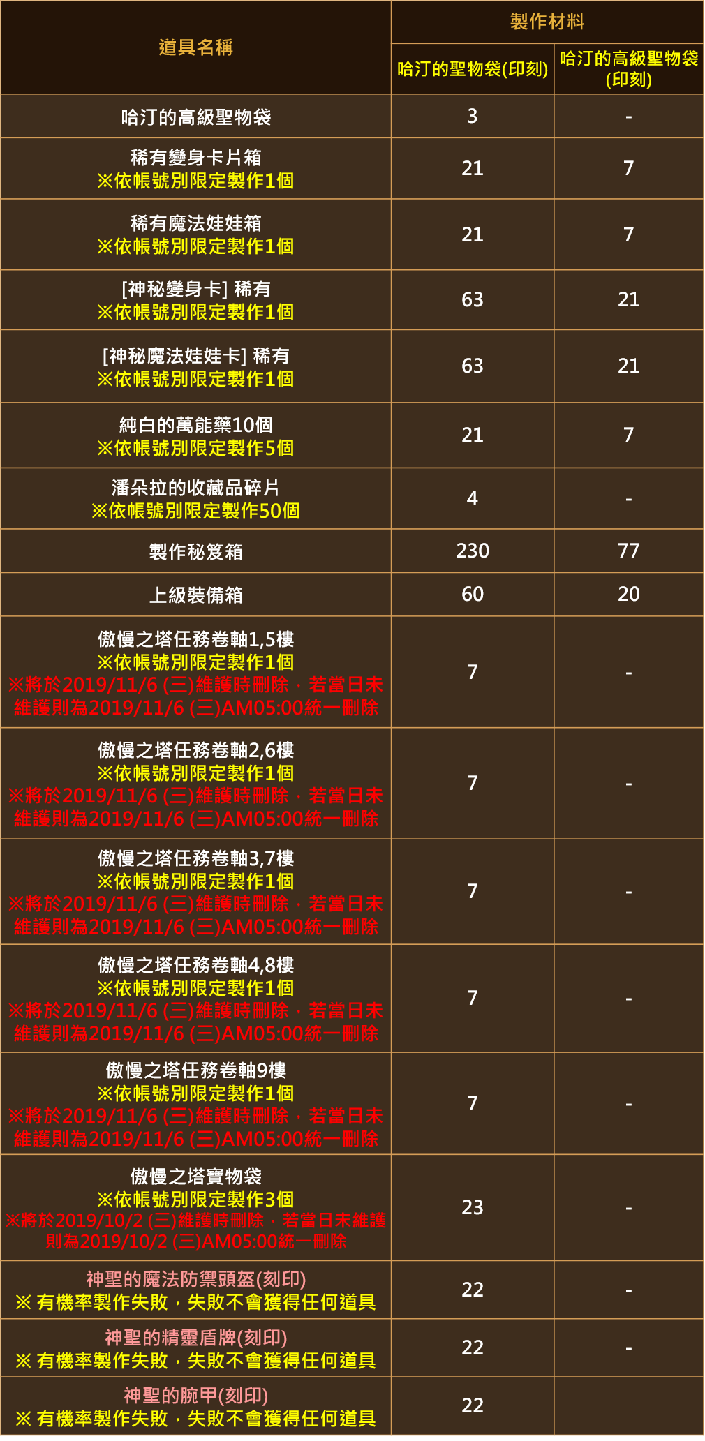 ※如伺服器限定製作的的道具無法選擇製作(該伺服器已無道具製作數量),『哈汀的聖物袋(刻印)』、『哈汀的高級聖物袋(刻印)』仍可進行其他用途,將無法返還已購買或已消耗之哈汀的聖物袋(刻印)或哈汀的高級聖物袋(刻印)。