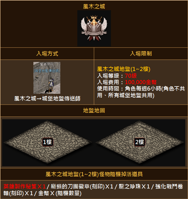1.肯特城、妖魔城堡、風木之城新增可透過城堡地監傳送師進入城堡地監。