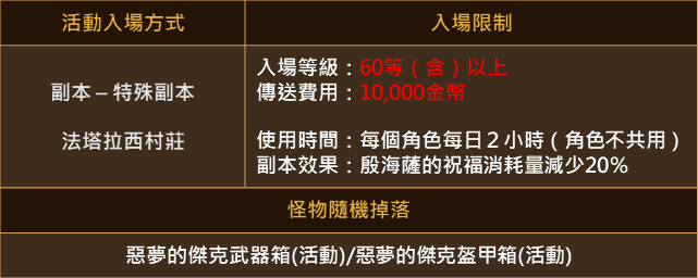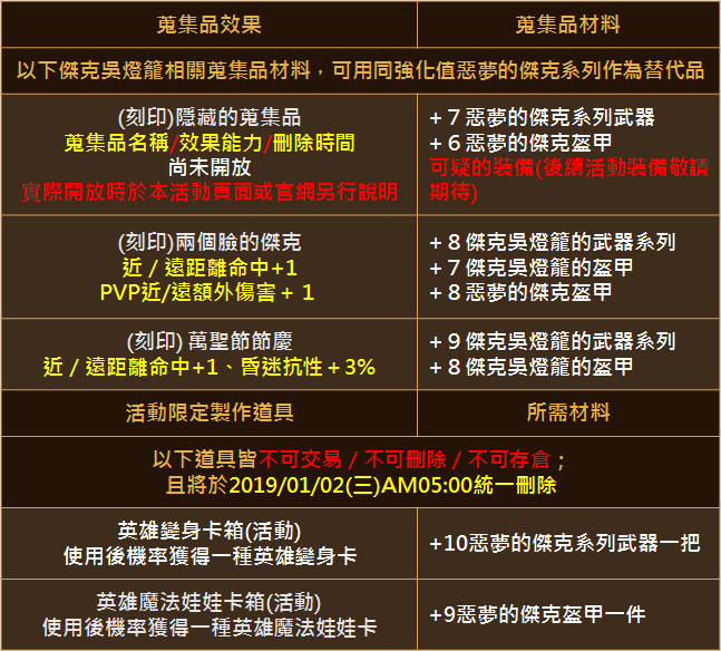 這次活動台灣直接與韓版同步推出,舉辦聖誕節派對活動,在活動副本中可以打到惡夢的傑克裝備,強化到神裝等級就可以直接換取紅變、紅娃箱,雖然機率不高,但是從開服到現在很多人還是藍的,或許這一次拚了就有紅啦!大家去拚拚手氣運氣吧!