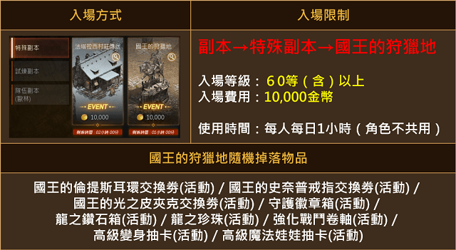 - 活動期間內60(含)等以上玩家,可透過『副本→特殊副本』進入「國王的狩獵地」,副本內會掉落各式交換券及戰鬥支援品等等。