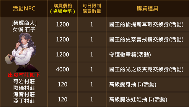 - 活動期間內奇岩村莊/歐瑞村莊/海音村莊/亞丁村莊將會出沒[榮耀商人]女僕 石子,可使用「名譽金幣」不等與之交換各式裝備交換券、高級變身抽卡、高級魔法娃娃抽卡。