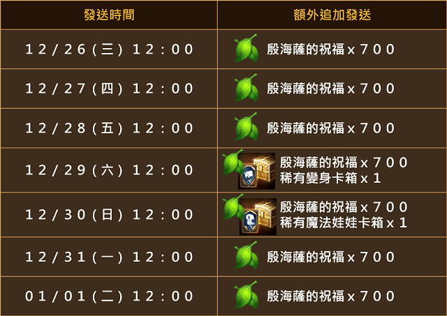 - 2018/12/26(三)至2019/1/1(二)每日額外發送殷海薩的祝福,週六及週日會再追加發送「稀有變身卡箱」或「稀有魔法娃娃卡箱」喔!