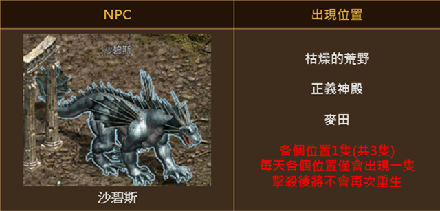 1. 每日晚上21:30,沙碧斯將於枯燥的荒野、正義神殿、麥田三地出沒。