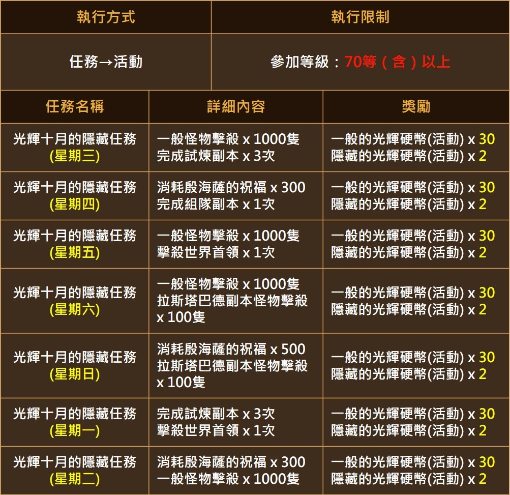 下圖是官方的活動說明,上面寫著每天執行的活動任務和獎勵,不過可能是因為只標示「星期一」而不是「每 星期一」導致不少網友誤以為活動只有一個禮拜而已。