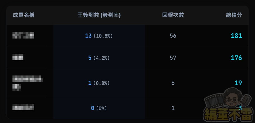 - 成員貢獻度:紀錄每位成員的紀錄次數與簽到頻率,方便管理層評估戰力分配。