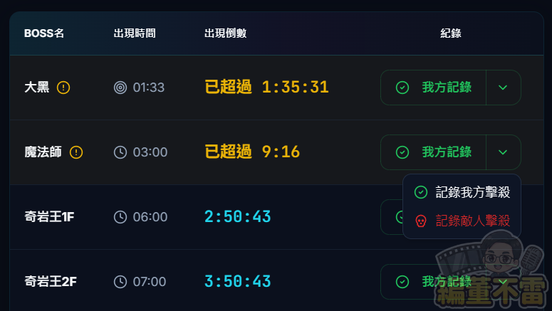 - 已超過:當 BOSS 出現但尚未紀錄時,時間會變為 亮黃色 並顯示超時時間,提醒團隊 BOSS 可能已經出現。