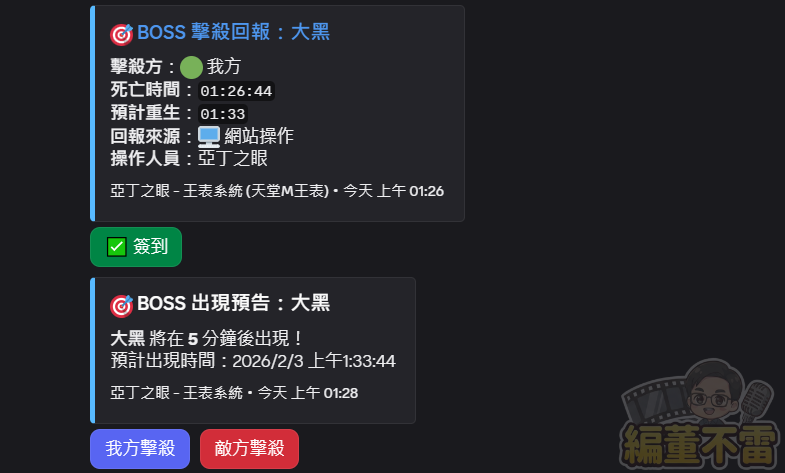 - ✅ 即時簽到按鈕:通知訊息會附帶一個「簽到」按鈕。參與打王的盟友只要輕輕一點,系統就會自動將其列入該場次的簽到名單中,免去事後人工對帳的麻煩。