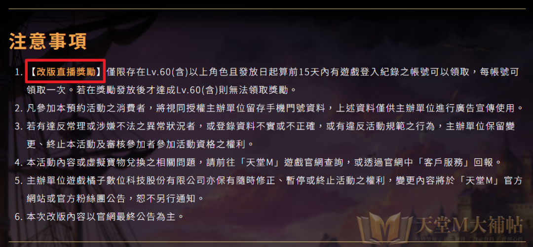 在預登網頁最下方不起眼的注意事項中提及「改版直播獎勵」,雖然大家應該不意外有改版直播,但有公告表示日子越來越接近,想要免費拿獎勵務必完成一條件:帳號15天內有登入遊戲紀錄,並要有60級以上角色。