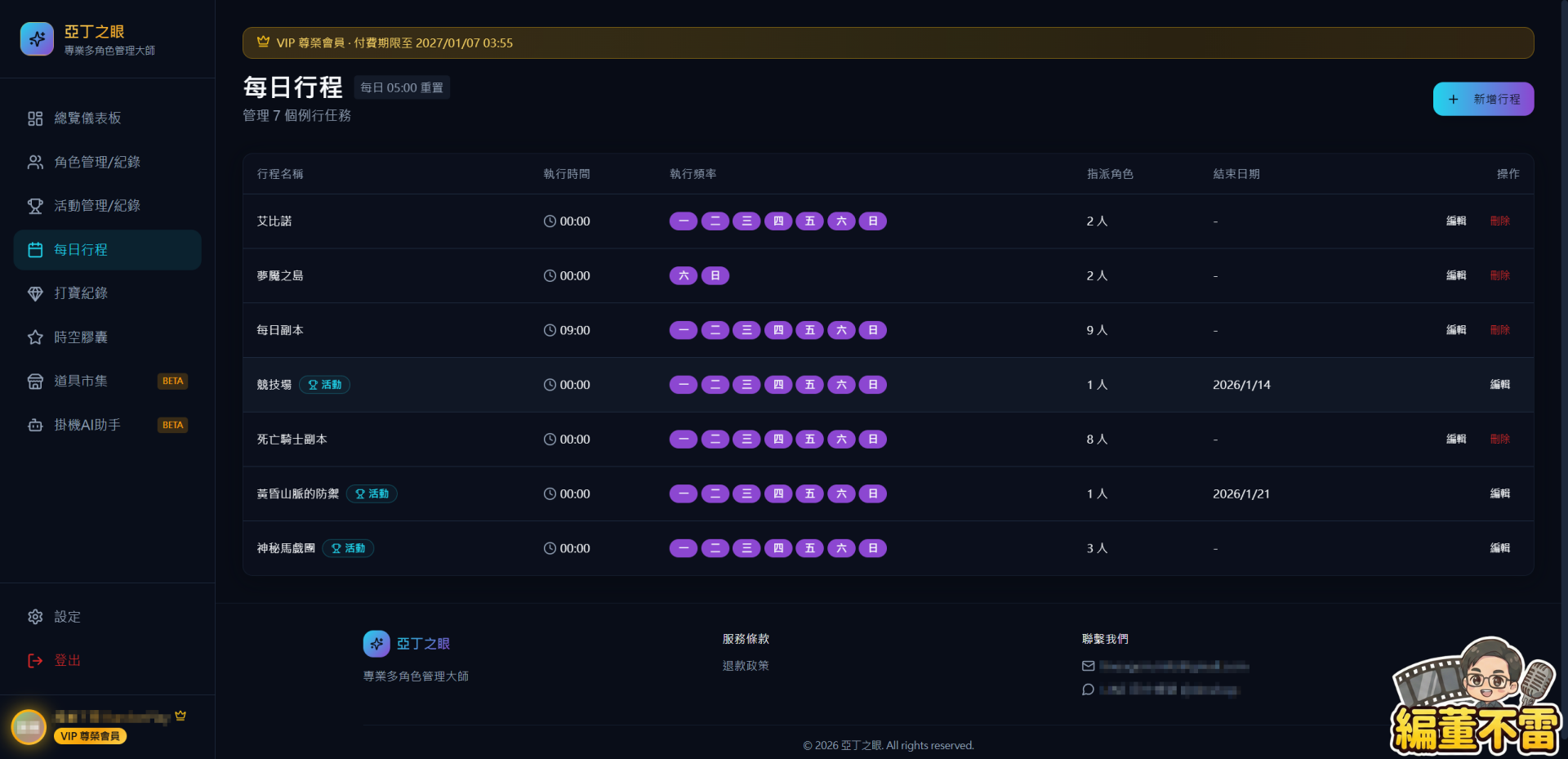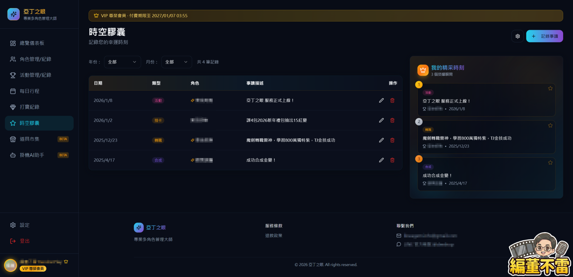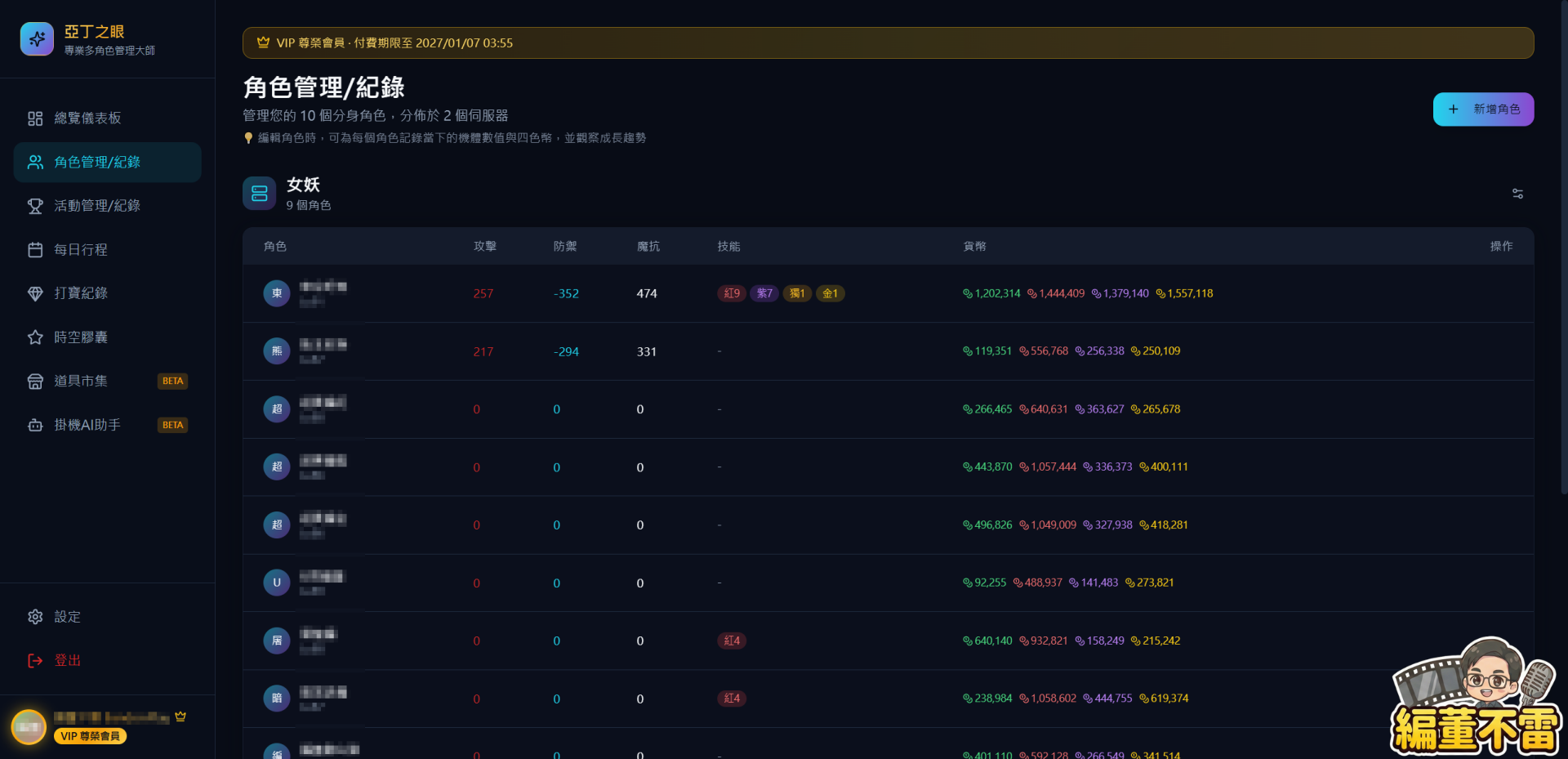 遊戲的世界廣闘且充滿挑戰,但管理多個角色不該成為負擔。亞丁之眼 讓你專注於遊戲本身的樂趣,把繁瑣的記錄與追蹤交給我們。