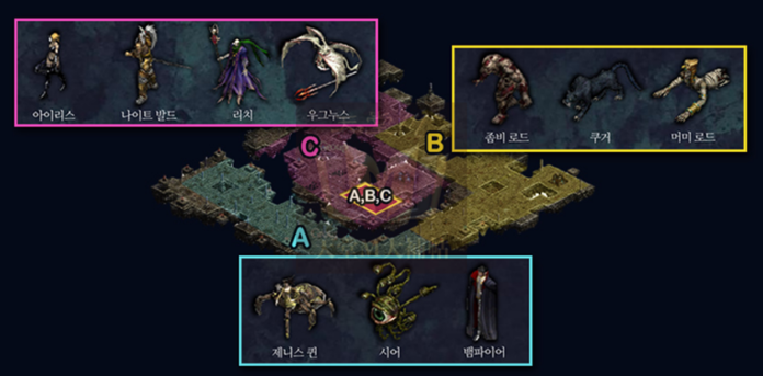 裡面的怪物可沒有所謂的「小怪」全部都是傲慢之塔 1~ 10 樓的 BOSS,可以說是傲慢之塔野生動物園 (?),下圖可看到各區域出現 BOSS 的類型,可以根據狩獵的地方選擇對應的裝備和武器屬性 (別擔心,設定都跟正常 BOSS 一樣,但其中中間的祭壇區是大雜燴,將會出現所有傲塔的 BOSS 且有機率掉落 BOSS 對應的娃娃卡,譬如吸血鬼、木乃伊王、艾莉絲、騎士范德、巫妖等等。