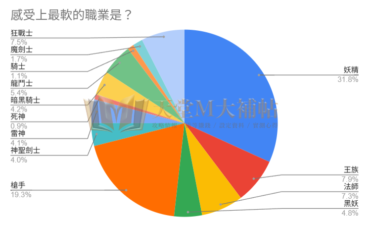調查結果最軟職業,票選最高的前2名為遠攻職業妖精(31.8%)、槍手(19.3%),近戰職業(含法師)前五名(票數高到低)為:王族(7.9%)、狂戰士(7.5%)、法師(7.3%)、龍鬥士(5.4%)、黑妖(4.8%)。