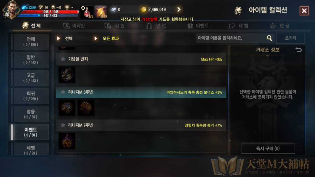 目前所有紅利收藏道具從一週年至今加總需要1865紅利,大約商城購買1000內的鑽石商品可達成 (1鑽可得2紅利),這套收藏可增加12%經驗值獎勵、HP+365、藥水恢復率+2%、殷海薩補充+2%、殷海薩消號降低2%,是CP值超高的必備品。