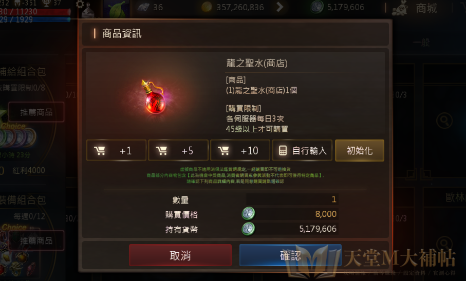 新服獲得經驗的速度不比舊服,且低等怪能獲得的經驗值也相對較低,在新篇章2.0商城中只要等級達到 45 以上就可用名譽金幣購買龍之聖水,可以補充 1500 個殷海薩祝福外,額外給予 31,920,000 經驗值,每日可購買3個共可獲得95,760,000經驗,有拚等級、拚排名需求者可斟酌。